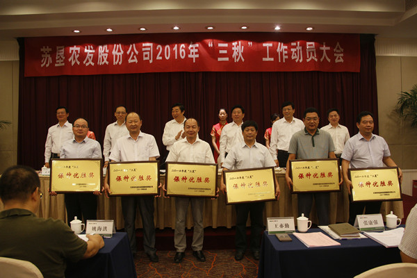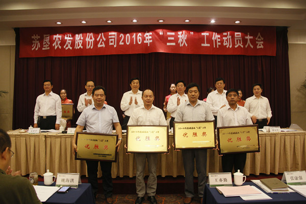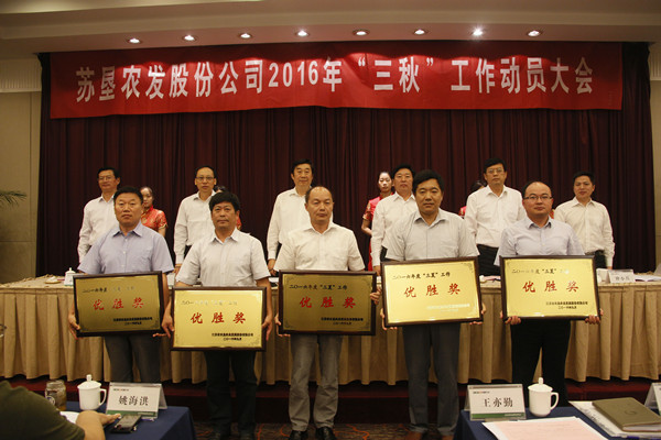 • 9月25日,蘇墾農發股份公司在南京召開2016年“三秋”工作動員大會。省農墾集團公司總經理、蘇墾農發股份公司董事長胡兆輝主持會議并講話。省農墾集團公司黨委委員、蘇墾農發股份公司總裁蘇志富講話。蘇墾農發股份公司副總裁許峰作“三秋”工作部署。