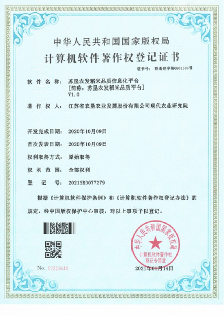 2021年1月,蘇墾農科院成功獲得《蘇墾農發稻米品質信息化平臺》(登記號:2021SR0077279)國家版權局頒發的計算機軟件著作權登記證書,這標志著蘇墾農發稻米品質評價體系經過近三年的科學研究和技術攻關,取得了階段性的成果。
