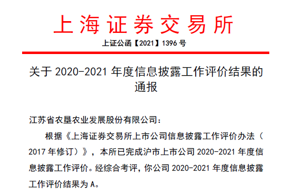 • 日前,上海證券交易所公布滬市主板上市公司2020-2021年度信息披露工作評價結果,蘇墾農(nóng)發(fā)(股票代碼:601952)獲評最高等級“A”級,是蘇墾農(nóng)發(fā)上市以來連續(xù)第二年獲得信息披露工作最高評級。
