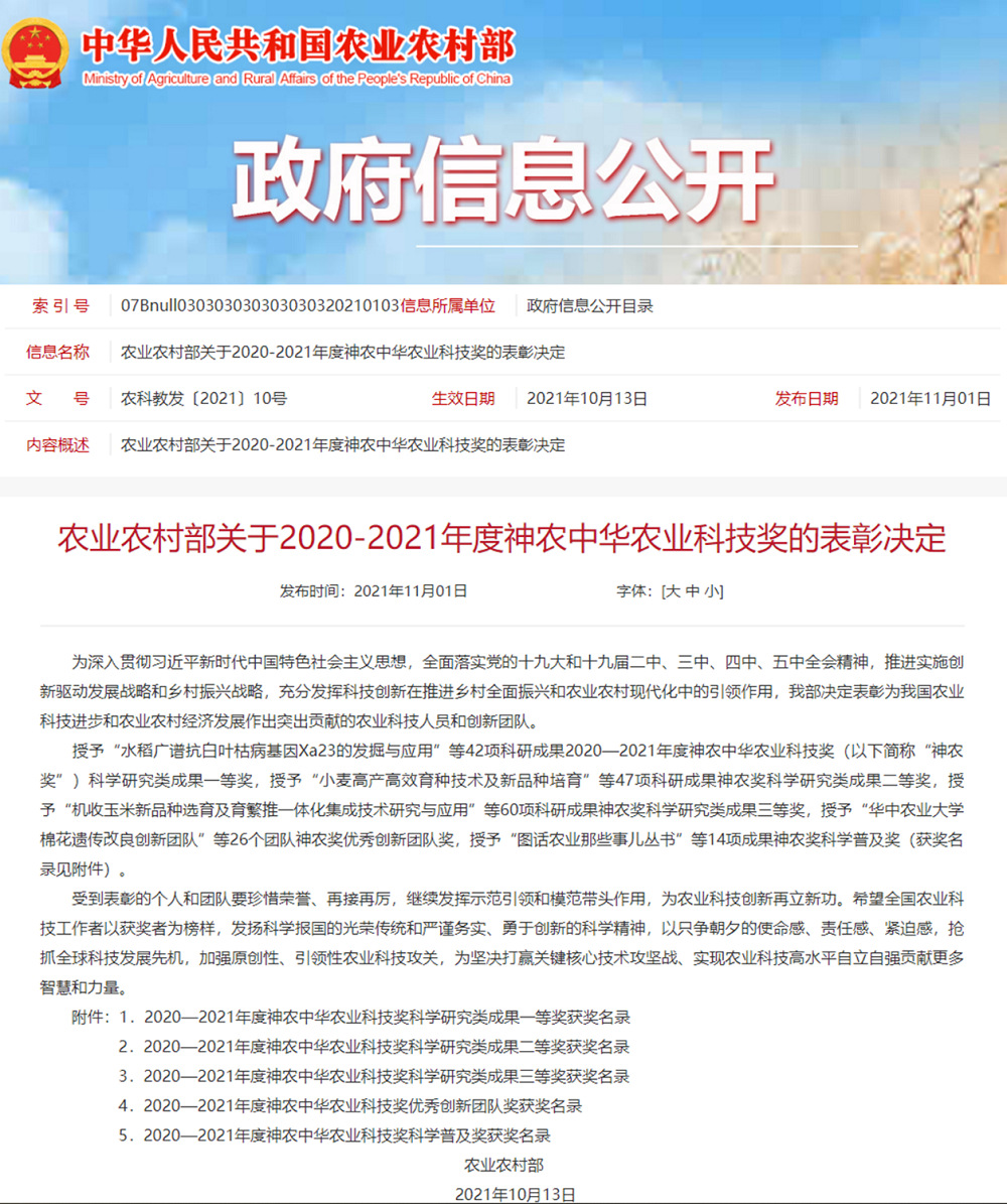 11月1日,農(nóng)業(yè)農(nóng)村部官網(wǎng)發(fā)布了《關(guān)于2020-2021年度神農(nóng)中華農(nóng)業(yè)科技獎的表彰決定》(農(nóng)科教發(fā)〔2021〕10號),對在2020-2021年度為我國農(nóng)業(yè)科技進步和農(nóng)業(yè)農(nóng)村經(jīng)濟發(fā)展作出突出貢獻的農(nóng)業(yè)科技人員和創(chuàng)新團隊進行表彰。由江蘇省農(nóng)墾農(nóng)業(yè)發(fā)展股份有限公司主持,聯(lián)合江蘇省農(nóng)業(yè)技術(shù)推廣總站、揚州大學(xué)共同完成的“稻麥兩熟畝產(chǎn)1200公斤綠色高效關(guān)鍵技術(shù)創(chuàng)新與應(yīng)用”項目獲得科學(xué)研究類成果三等獎。