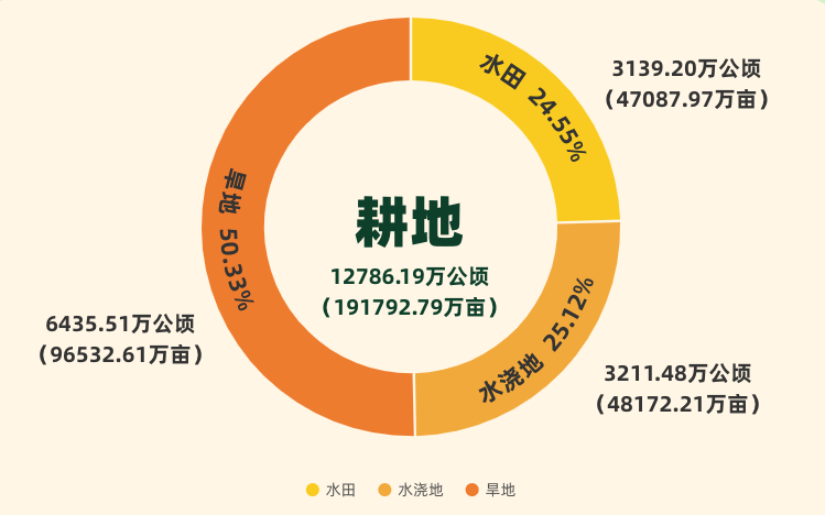 《公報》顯示:我國耕地19.18億畝,其中水田4.71億畝,占24.55%;水澆地4.81億畝,占25.12%;旱地9.65億畝,占50.33%64%的耕地分布在秦嶺—淮河以北。黑龍江、內蒙古、河南、吉林、新疆等五個省份耕地面積較大,占全國耕地的40%。位于一年三熟制地區的耕地2.82億畝,占全國耕地的14.73%;位于一年兩熟制地區的耕地7.17億畝,占37.40%;位于一年一熟制地區的耕地9.18億畝,占47.87%