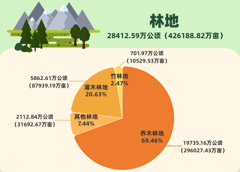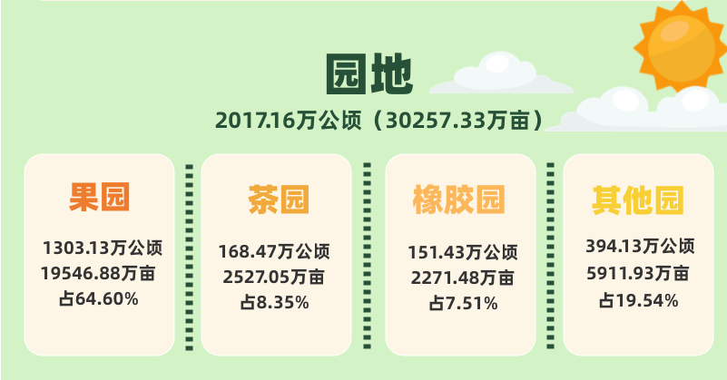 《公報》還顯示:我國園地面積3.03億畝。其中果園1.95億畝,占64.60%;茶園0.25億畝,占8.35%。草地39.68億畝。其中天然牧草地31.98億畝,占80.59%;人工牧草地0.09億畝,占0.22%。林地42.62億畝。濕地3.52億畝。城鎮村及工礦用地5.3億畝。其中村莊用地3.29億畝,占62.13%。交通運輸用地1.43億畝。其中農村道路0.71億畝,占49.88%。水域及水利設施用地5.44億畝。其中水庫水面0.51億畝,占9.28%;坑塘水面0.96億畝,占17.69%;溝渠0.53億畝,占9.69%