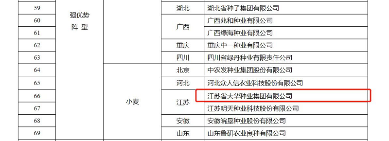 為貫徹黨中央、國務(wù)院種業(yè)振興決策部署,深入實(shí)施種業(yè)企業(yè)扶優(yōu)行動,近日農(nóng)業(yè)農(nóng)村部辦公廳印發(fā)《關(guān)于扶持國家種業(yè)陣型企業(yè)發(fā)展的通知》,根據(jù)企業(yè)規(guī)模、創(chuàng)新能力和發(fā)展?jié)摿Φ汝P(guān)鍵指標(biāo),從全國3萬余家種業(yè)企業(yè)中遴選了69家農(nóng)作物、86家畜禽、121家水產(chǎn)種業(yè)企業(yè)機(jī)構(gòu),集中力量構(gòu)建“破難題、補(bǔ)短板、強(qiáng)優(yōu)勢”國家種業(yè)企業(yè)陣型,加快打造種業(yè)振興骨干力量。江蘇省大華種業(yè)集團(tuán)有限公司入選“國家農(nóng)作物種業(yè)陣型企業(yè)·強(qiáng)優(yōu)勢陣型(小麥)”。