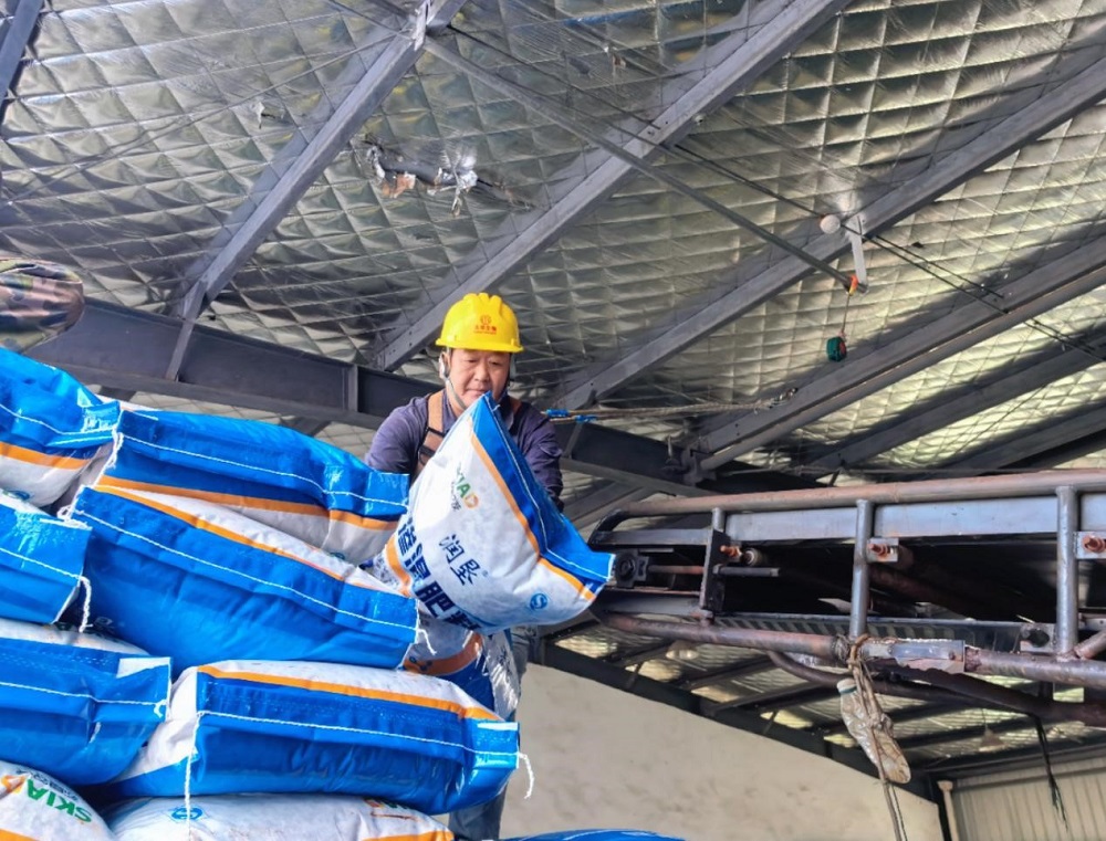 (蘇墾農服子公司淮安大華生物科技有限公司運輸車輛裝運“潤墾”牌摻混肥料準備送往種植大戶手中)