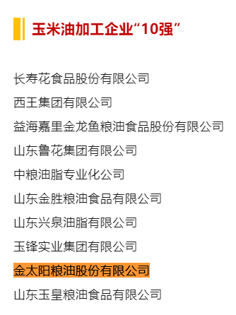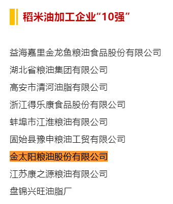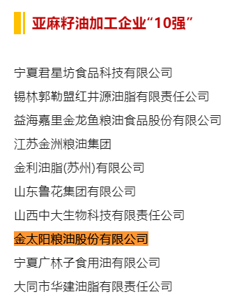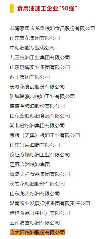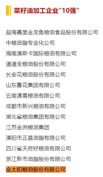 喜報!2024年食用油加工企業“50強”、“10強”公示名單,金太陽糧油入選榜單!
