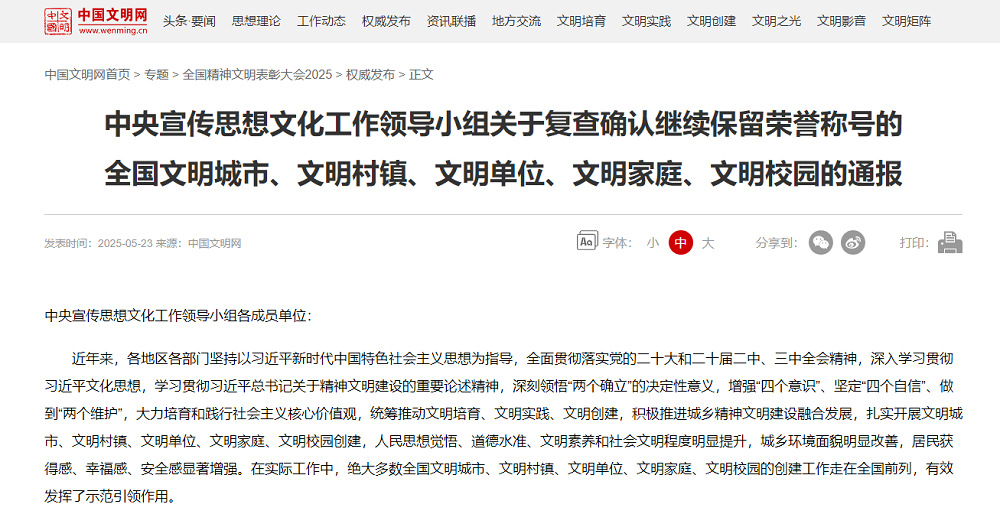 5月23日,中央宣傳思想文化工作領(lǐng)導(dǎo)小組公布《關(guān)于認(rèn)定命名第七屆全國(guó)文明城市、文明村鎮(zhèn)、文明單位和第三屆全國(guó)文明家庭、文明校園的決定》和《關(guān)于復(fù)查確認(rèn)繼續(xù)保留榮譽(yù)稱號(hào)的全國(guó)文明城市、文明村鎮(zhèn)、文明單位、文明家庭、文明校園的通報(bào)》。蘇墾農(nóng)發(fā)順利通過復(fù)查評(píng)估,繼續(xù)保留“全國(guó)文明單位”稱號(hào),這是繼2020年首創(chuàng)首成第六屆“全國(guó)文明單位”后又一次獲此殊榮。